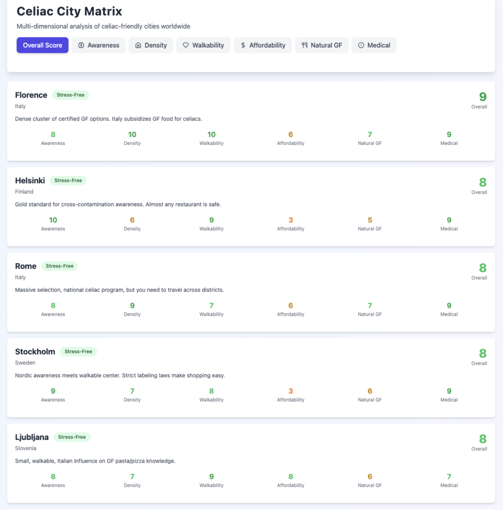 Buradan yola çıkarak söz konusu kıstaslarla çölyaklılar için en ideal şehirler listesi oluşturmaya çalıştım. Kendi deneyimlerimi kullandım, daha geniş çaplı veri toplama için GPT5 ve Claude gibi yapay zekâ modellerinden yardım istedim. Ve sonuçta 40’tan fazla şehri listeleyen bir tablo ortaya çıktı. Bu listede ilk sırada Floransa, ikinci sırada Helsinki var. Neden? Çünkü pahalılık da bir değerlendirme kıstası ve İskandinavya turistler için üzücü pahalılıkta.